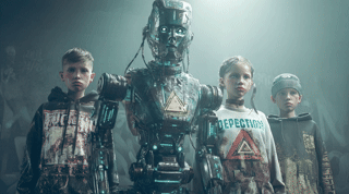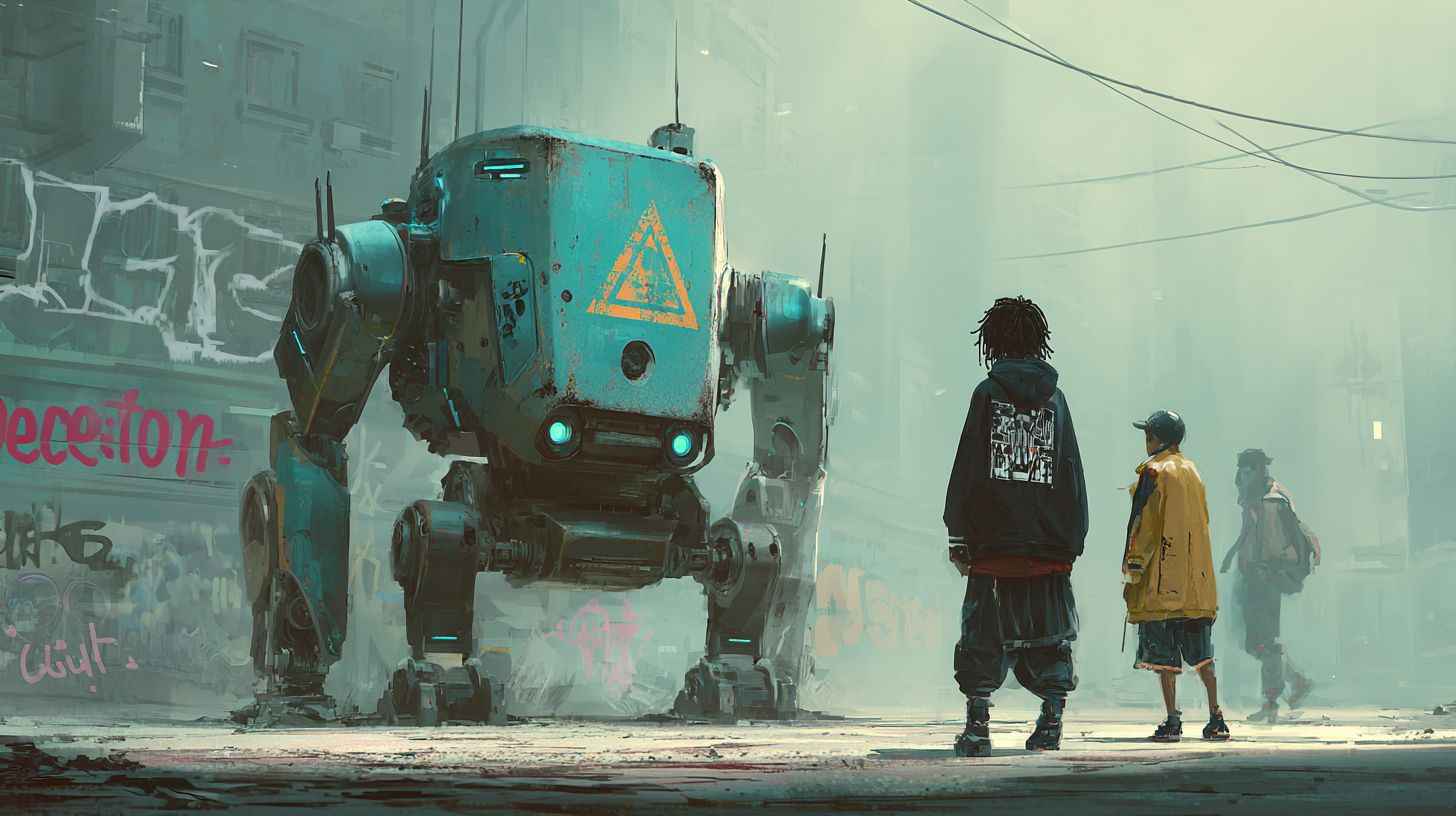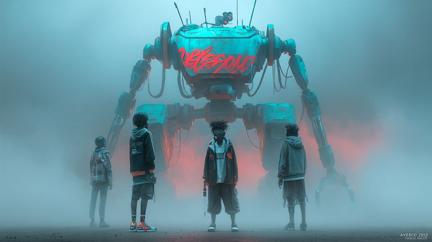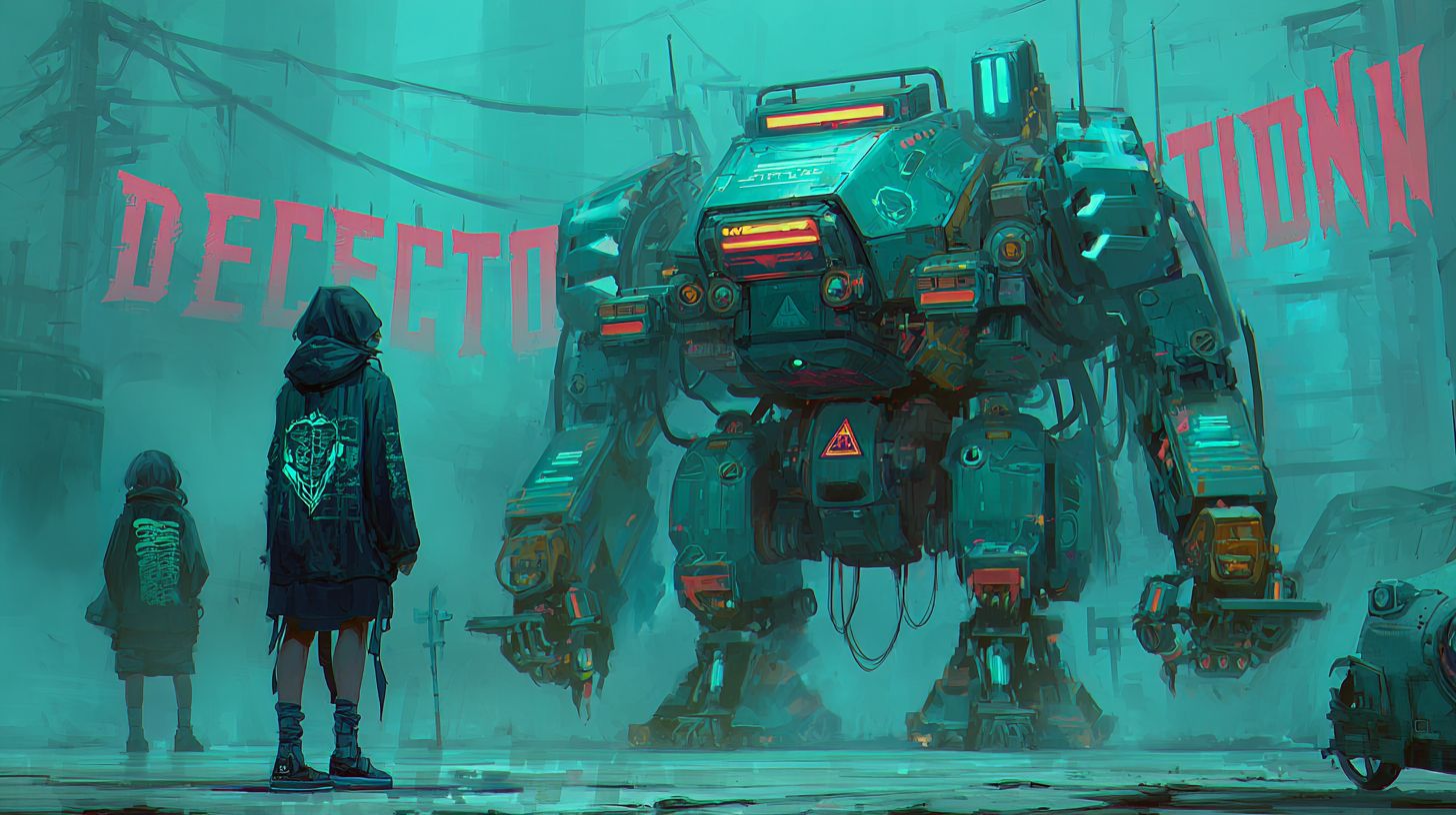wide angle, side profile portrait of a far future dark dystopian image of children being misled by a robot powered by AI. Cyberpunk mech with cybernetic upgrades and a metallic armour plated body wearing streetwear fashion, cybernetic arms, carbon turquoise armour, with "deception" written in the hazy background, graffiti, sinister futuristic death aura, triangle shadow nightmare inclination, turquoise led accents, digital artwork by Kienan Lafferty, cyberpunk style. Shot on an 85mm lens. --ar 16:9Artwork + original prompt by WellWired.