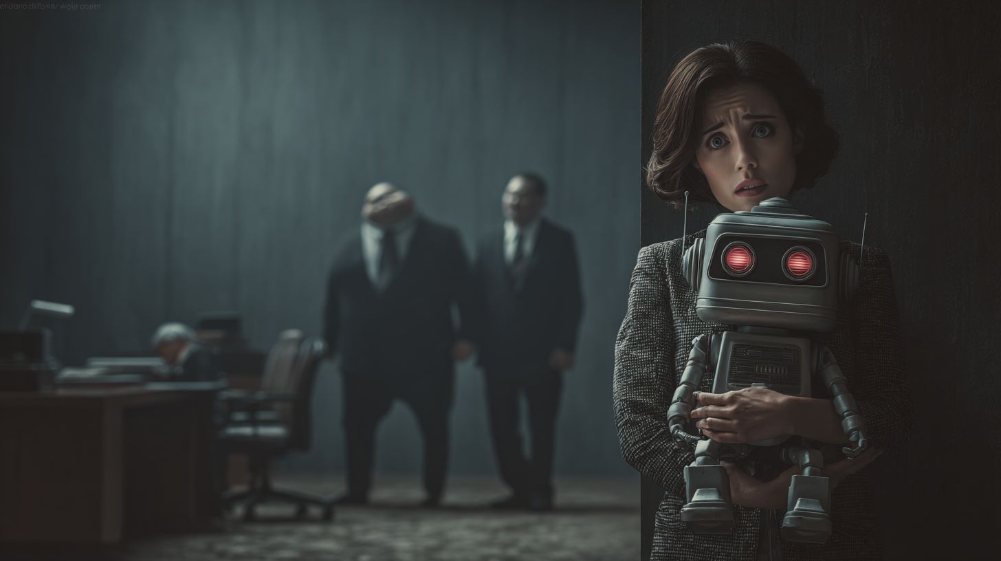 A frightened businesswoman holding a small robot