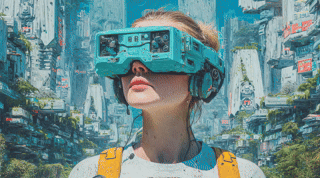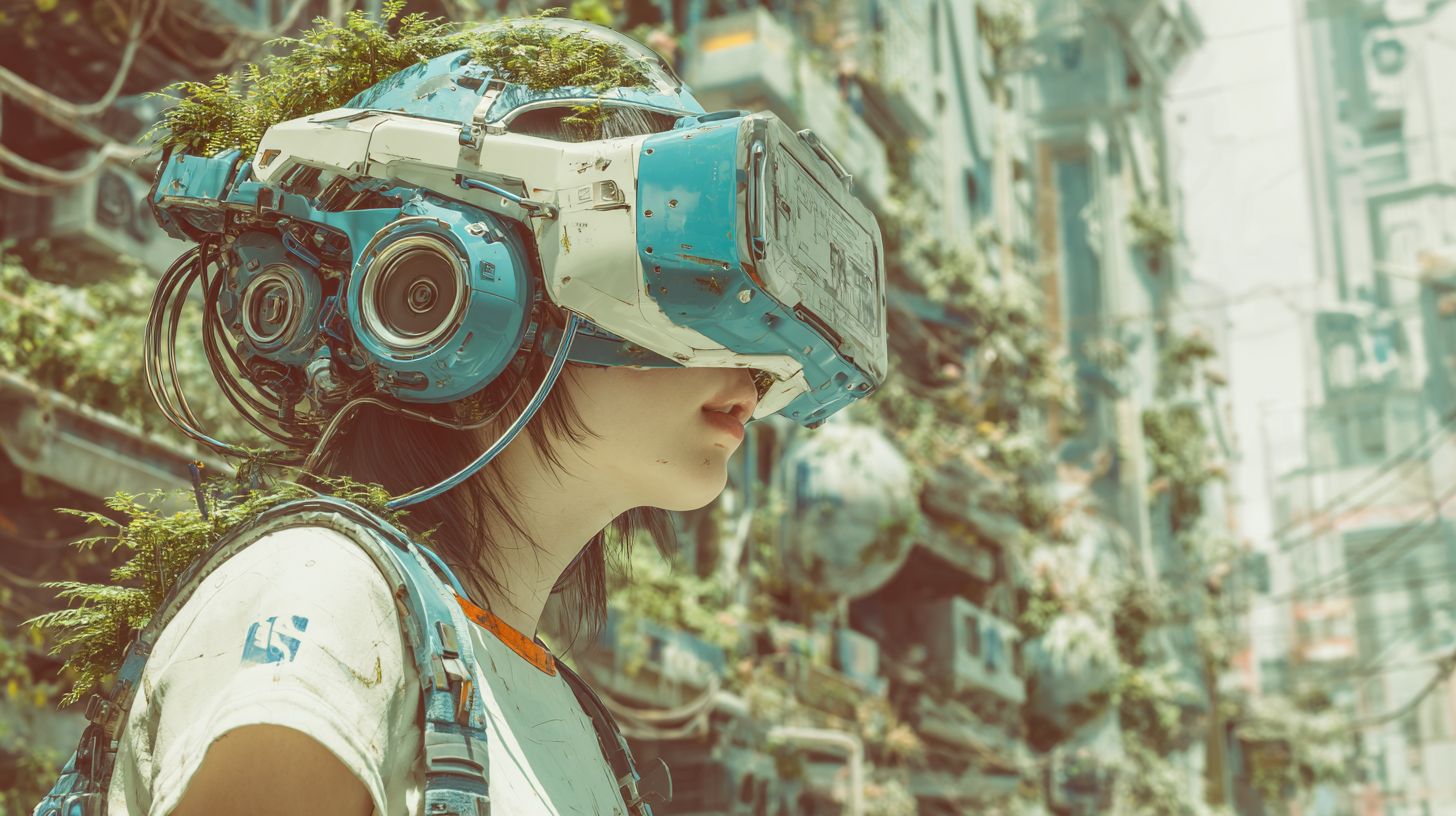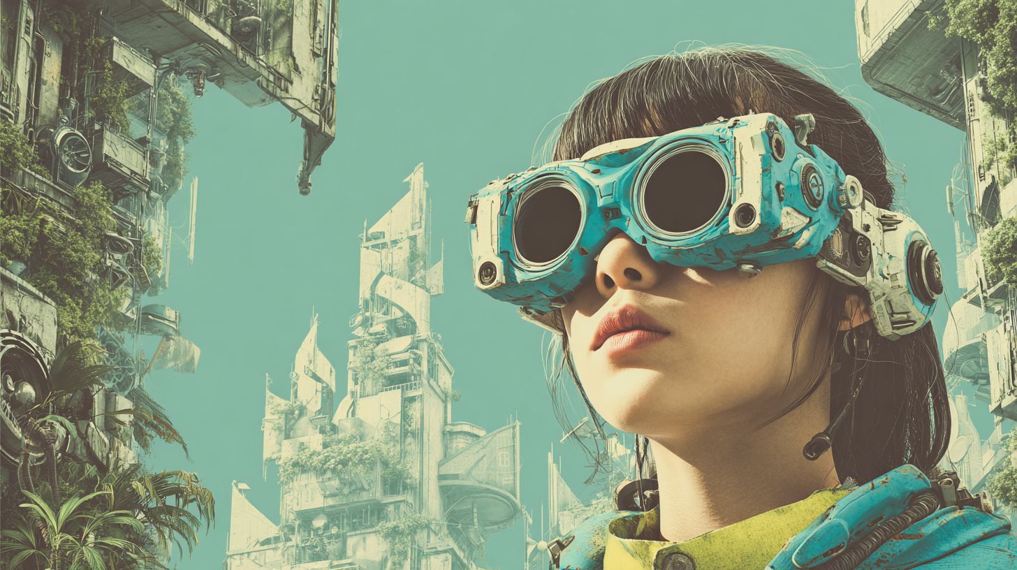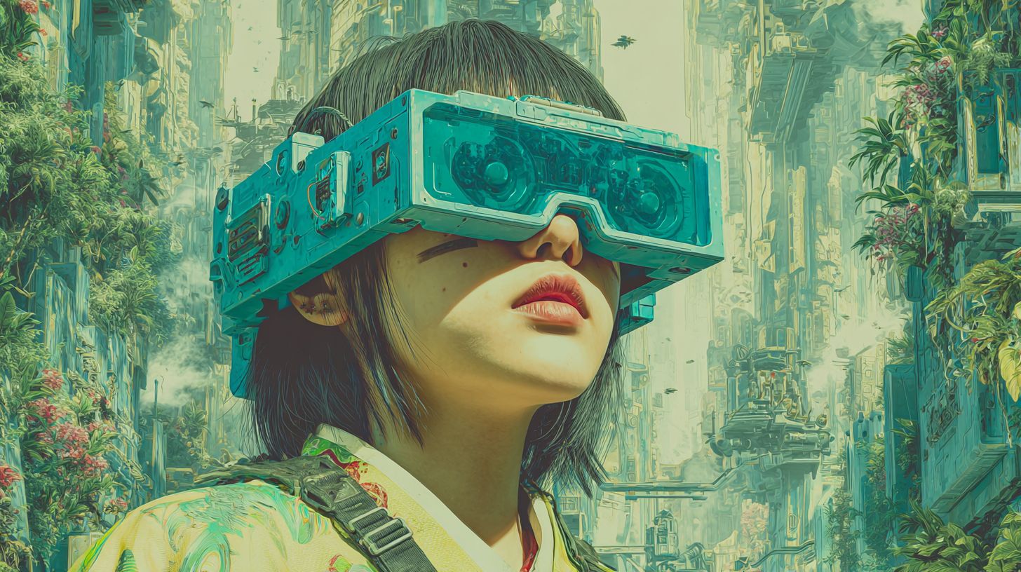 A young Japanese teenager wearing turquoise new plastic VR glasses with the mechanism overflowing to the outside and with with cybernetic upgrades. She is wearing casual clothes in a Cyberpunk style. In the background is a futuristic city street overflowing with plant life and advanced technology. Cinematic composition, high detail, realistic textures, bright vintage colour palette with subtle accents of hex colour #1EEDDC. Shot on an 85mm lens. -ar 16:9 Artwork + original prompt by WellWired.